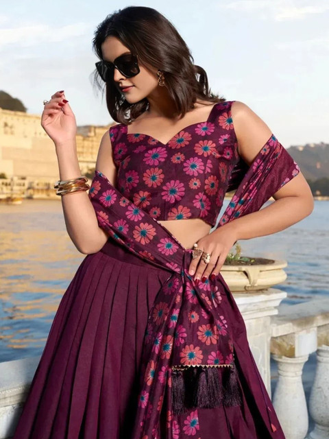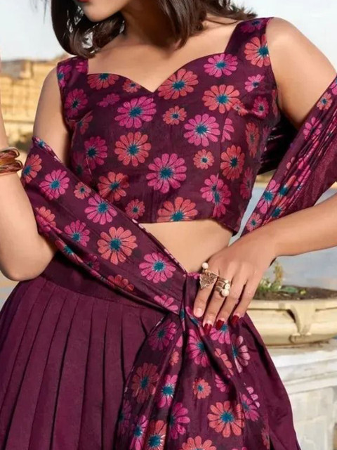 Purple and purple embroidered unstitched blouse, has a round neck, three-quarter sleeves, purple and purple embroidered semi-stitched lehenga, has zip closure, flared hem