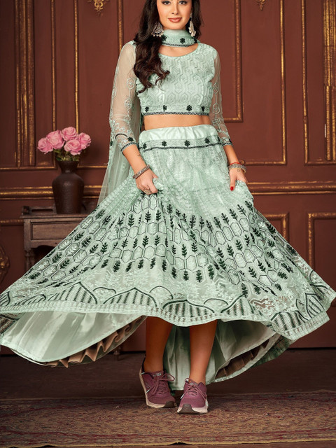 Blue and blue embroidered unstitched blouse, has a round neck, short sleeves, blue and blue solid semi-stitched lehenga, has zip closure, flared hem