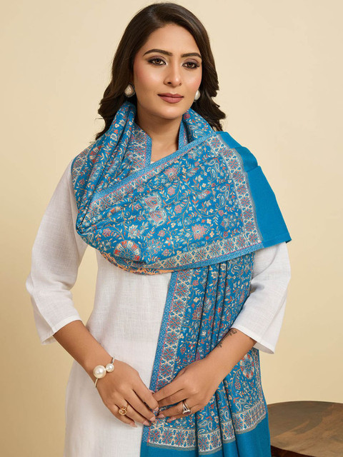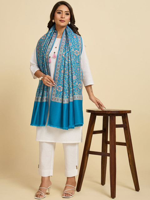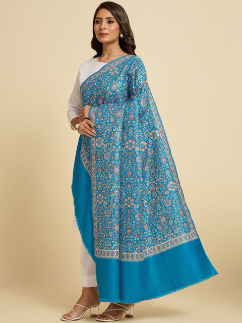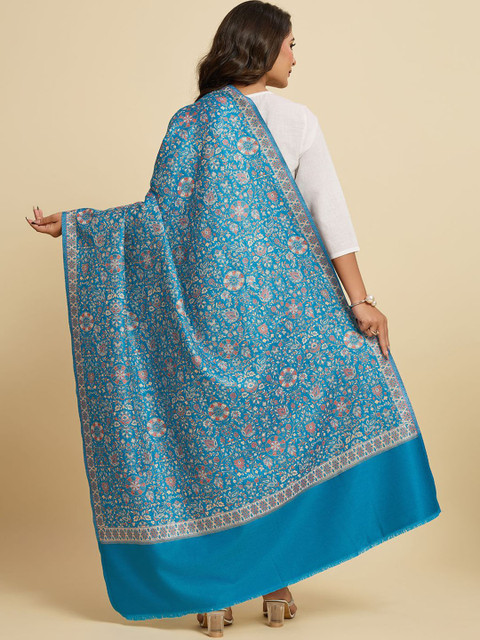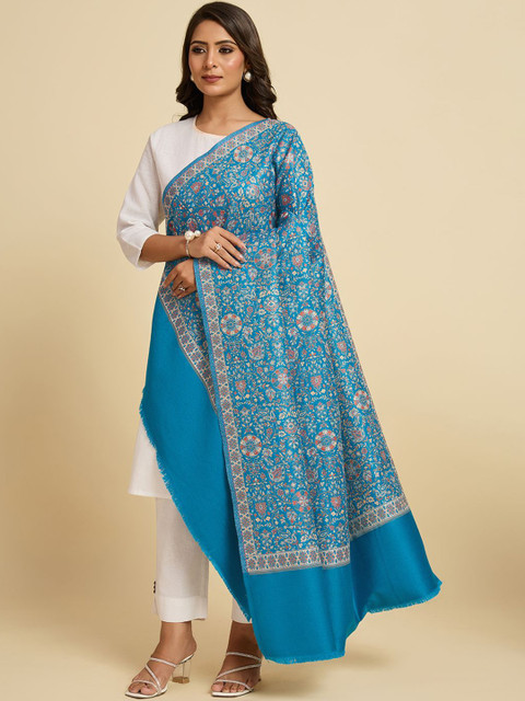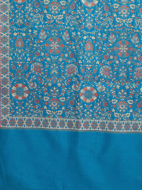 Turquoise blue and beige floral woven design woollen shawl has a solid border