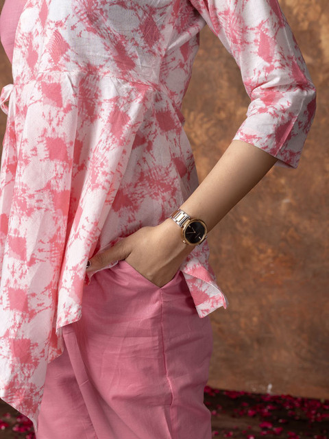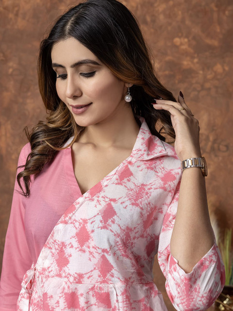 Pink and white printed Tunic has Round Neck collar, Three quarter Sleeves, Slip-on closure regular waist hem