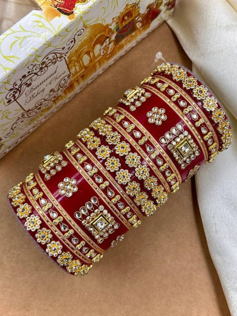 Set of 2 maroon and gold bangles each has a kundan stone studded secured with slip on closure