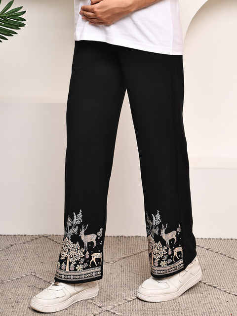 Black printed regular-fit mid-rise track pants has an elasticated waistband with slip-on closure and two pockets