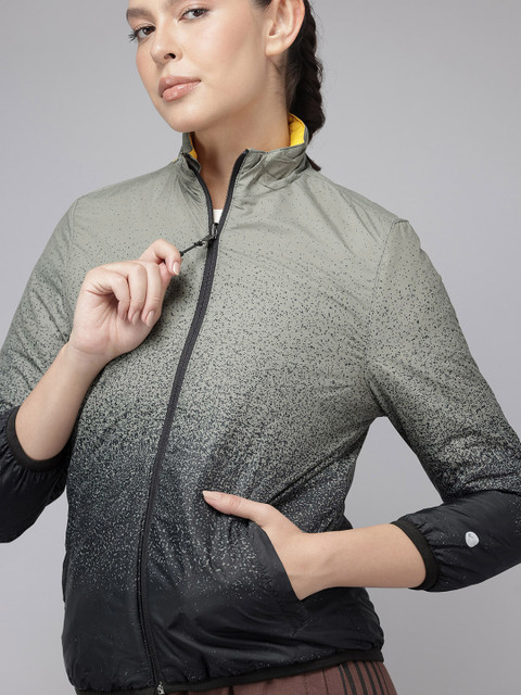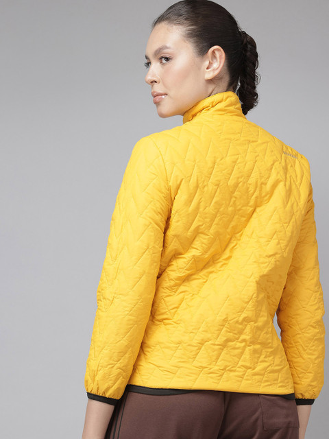 Olive green and yellow reversible padded jacket, has a mock collar, 2 pockets, has a zip closure, long sleeves, straight hemline, polyester lining