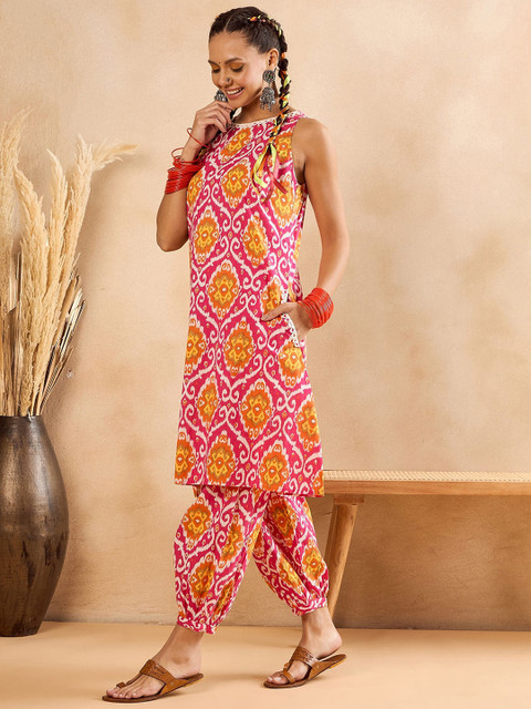Pink and white printed top, has a round neck sleeveless