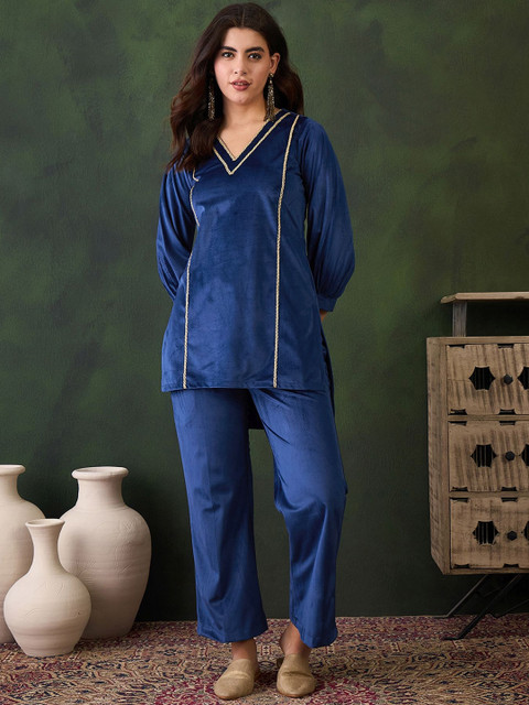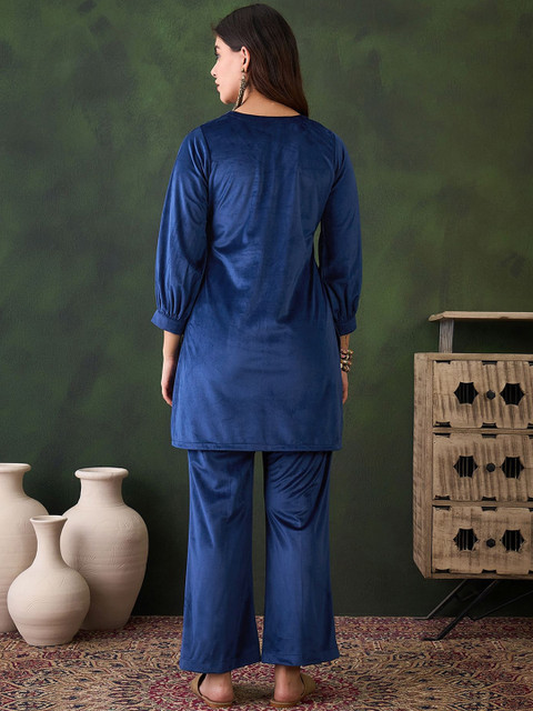 What a beautiful velvet suit . Color is very pretty . Neck and sleeve design is so beautiful . Perfect for winter season . Very. Stylish Coord set . Love the fitting and fabric . I am wearing size M . I am gifting this Coord set to my mom . It is very comfortable and perfect for winter season .