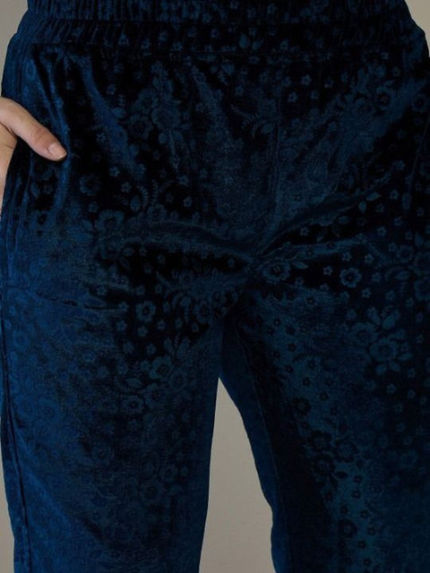 Navy blue self designed trousers, has an elasticated waistband with slip-on closure has 1 pockets