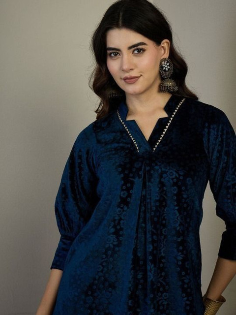 Navy Blue self designed top, has a v-neck and three quarter sleeves, secured with slip-on closure