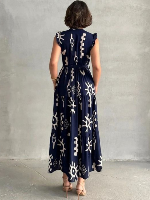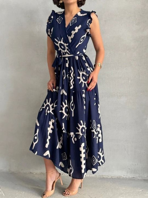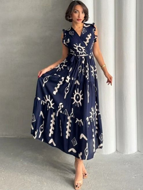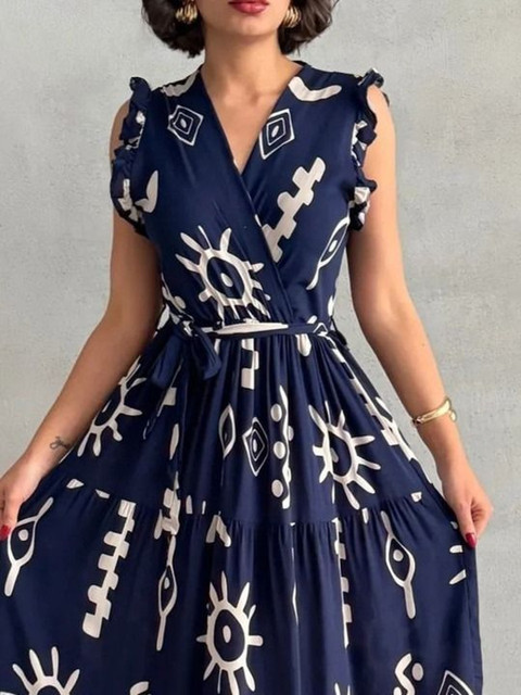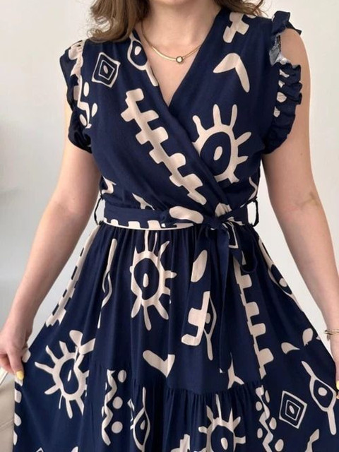 - Navy blue and navy blue abstract print wrap dress dress