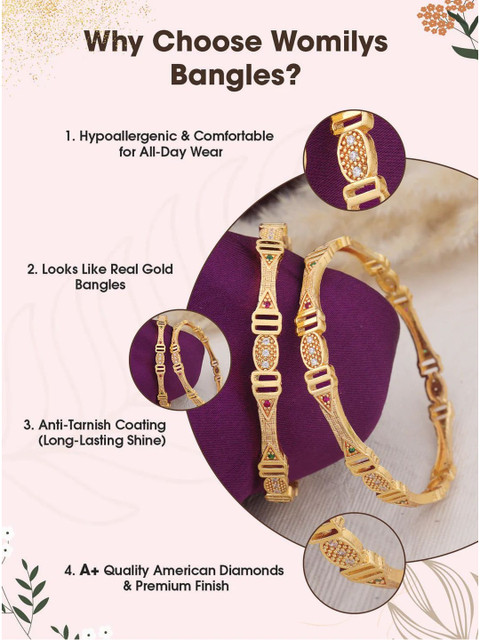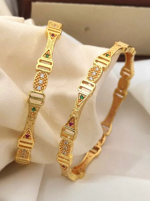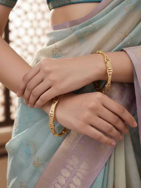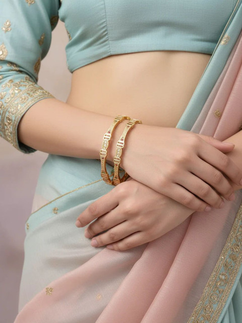 Pair these elegant gold-plated bangles show with your favorite saree, lehenga, or ethnic suit to elevate your festive look. Their timeless design adds a touch of sparkle and sophistication, making them perfect for weddings, celebrations, and special occasions.