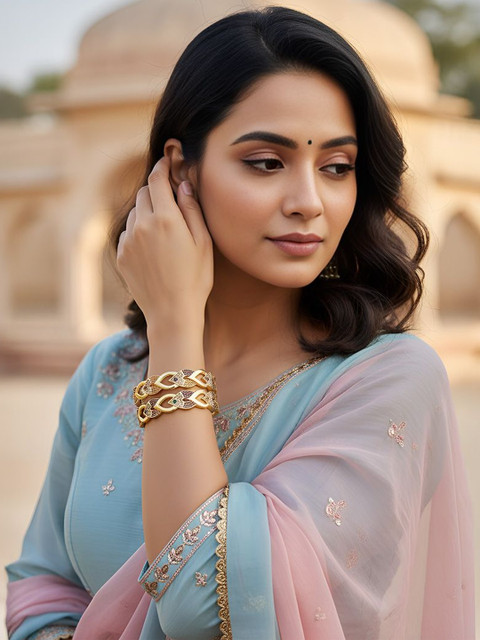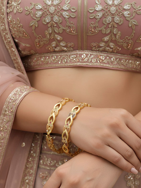 Pair these elegant gold-plated bangles show with your favorite saree, lehenga, or ethnic suit to elevate your festive look. Their timeless design adds a touch of sparkle and sophistication, making them perfect for weddings, celebrations, and special occasions.