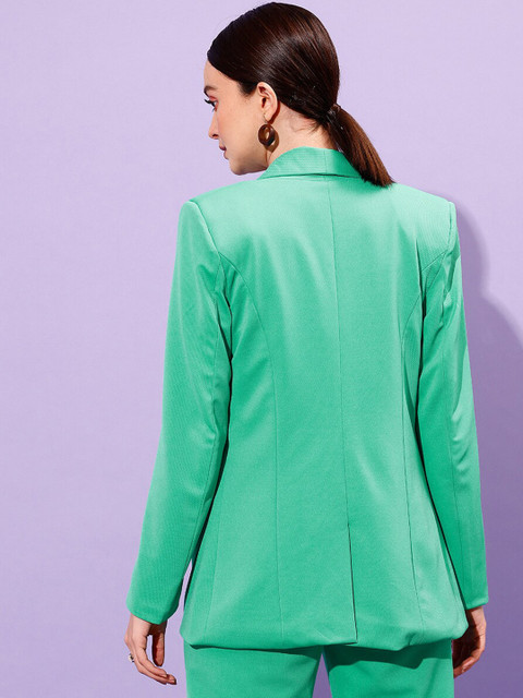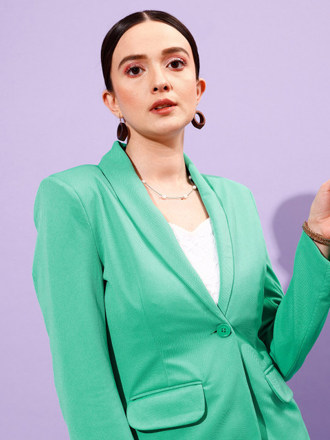 Green solid slim-fit formal blazer, has a shawl collar, single-breasted with a double button closure, long sleeves, two flap pockets and an attached lining