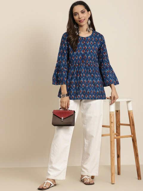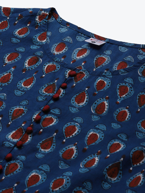 3 reviews for YASH GALLERY Navy Blue & Maroon Printed Bell Sleeves Pure Cotton A-Line Fusion Top