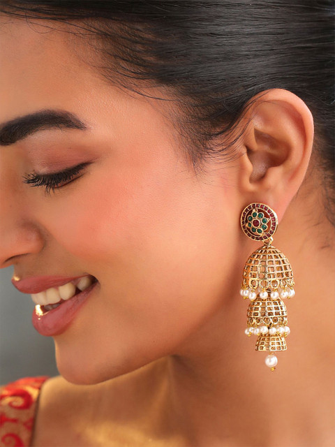 Gold-toned, red & green Dome Shaped gold-plated jhumkas,