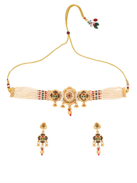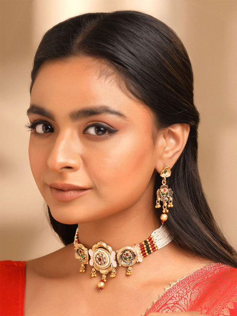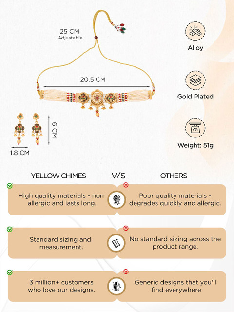 Enhance your elegance with the stunning jewellery set for women from brands: yellow chimes, expertly crafted from premium quality brass with a long-lasting gold plating. this exquisite necklace set for women features a white, red & green beautifully designed gold choker adorned with a touch of pearls, complemented by striking drop earrings that add a timeless charm. the one-size-fits-all design ensures versatility, making it a perfect addition to any woman’s jewellery collection. ideal for various occasions, this jewellery set is a thoughtful gift for a friend, daughter, or wife, appropriate for weddings, valentines day, anniversaries, or any special celebration. whether paired with a saree or any traditional attire, this stylish jewellery set for women is perfect for weddings and festivities, illuminating your look with every wear. people love the attractive design and impressive quality, while the adjustable features prevent any concerns about fitting issues. with no detachable parts, you can trust that your jewellery will arrive in perfect condition, ready to dazzle. make a statement at cultural events and religious ceremonies with this stunning temple jewellery set for women. featuring a choker set for women in the latest design, the gold plated jewellery set for women will grant you the elegance you seek in every layer. experience luxury without compromise with this beautiful jewellery set and elevate your collection today.