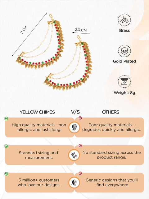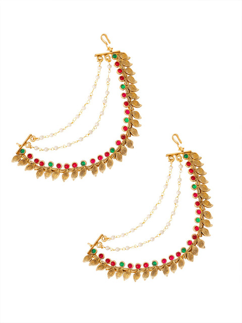 Gold-toned, red, green & white contemporary ear chains earrings, gold-plated, has pearls