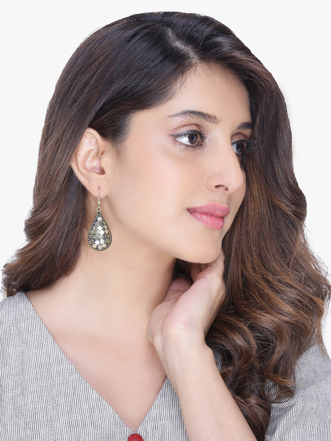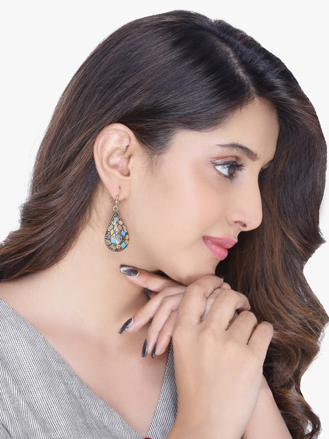 Black, gold toned and blue tear drop shaped earrings