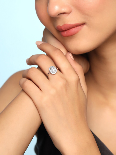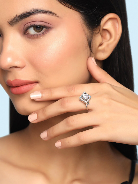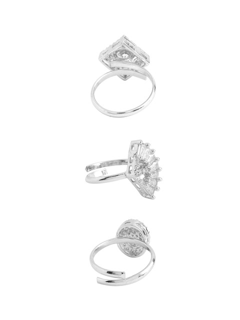 Silver-toned adjustable finger ring, has white AD-studded and diamond-shaped details
