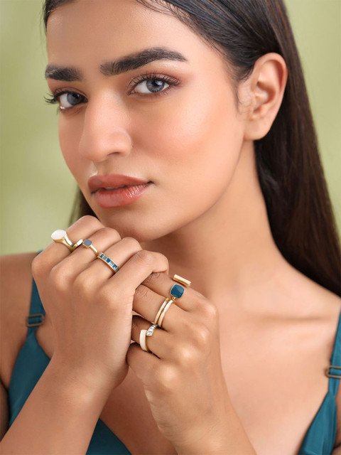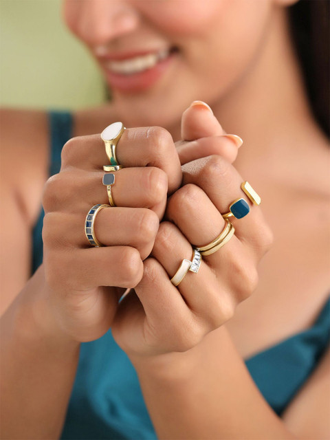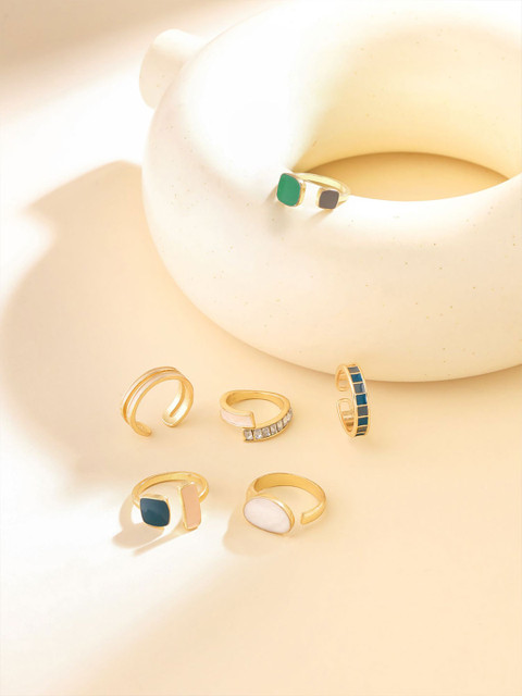 Set of 6 Gold-plated adjustable finger rings has artificial stones studded and shaped cut out and textured details