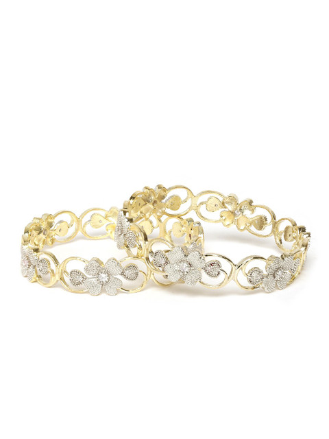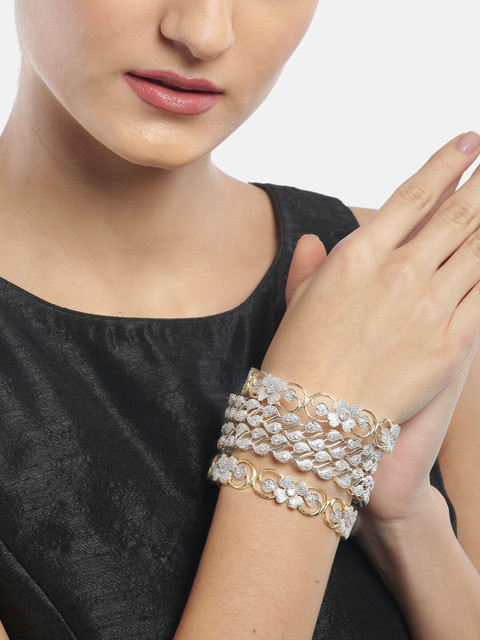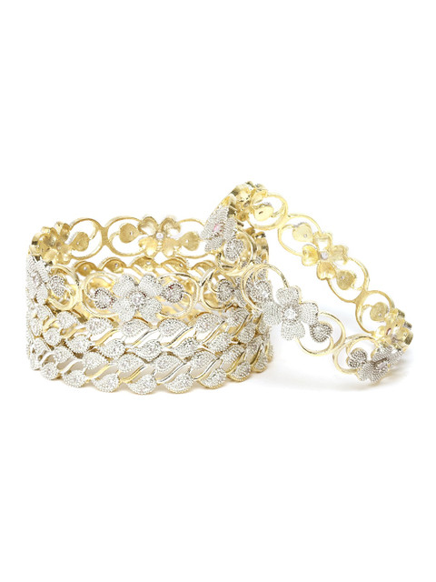 Set of 4 silver-toned gold-plated stone-studded floral patterned bangles