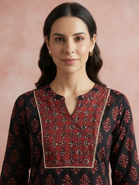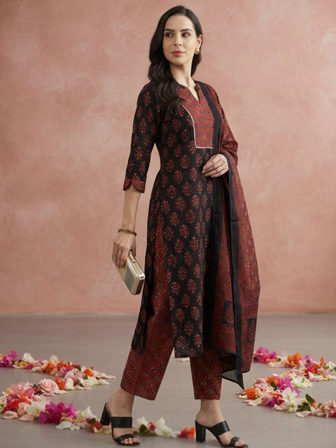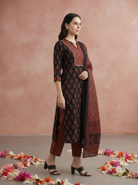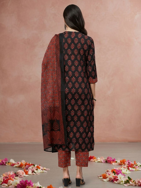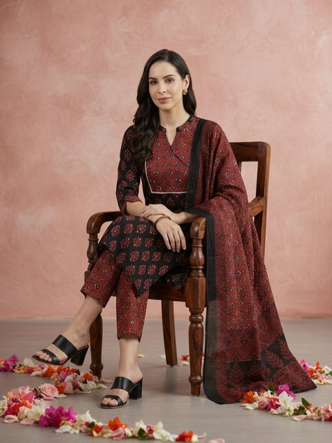 3 reviews for Yuris Women Black & Maroon Cotton Ethnic Motif Block Print Kurta with Trousers & Dupatta