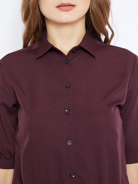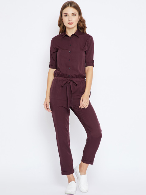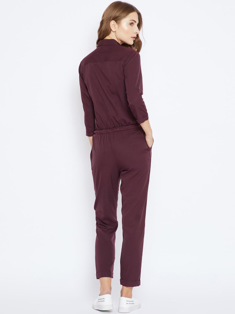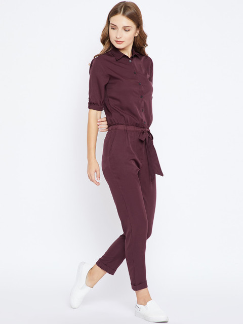 Burgundy solid basic jumpsuit with waist tie-ups ,has a shirt collar, short sleeves, 2 pockets