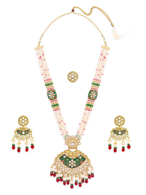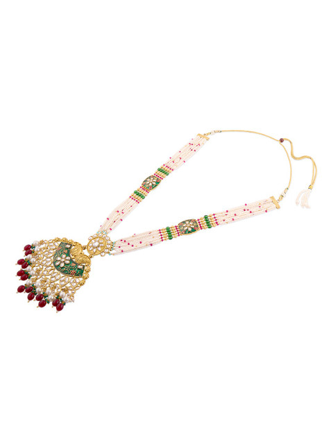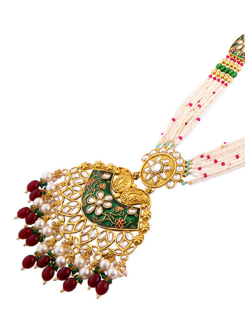 Gold-plated green meenakari necklace, has white Kundan-studded and red, pink and white beaded details