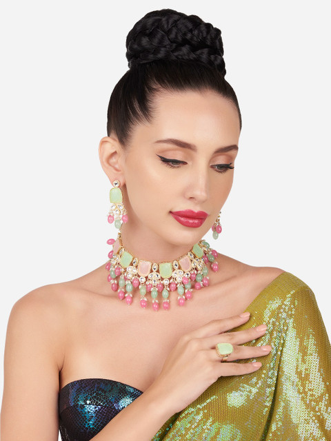 Gold-plated choker necklace has pink and green kundan-studded and pink and green beaded details