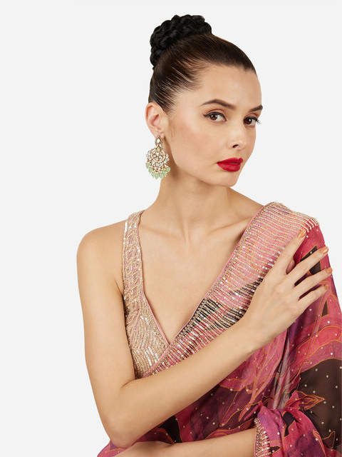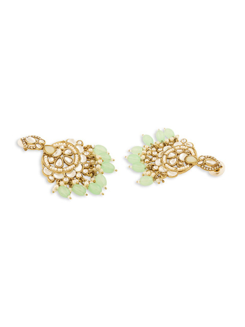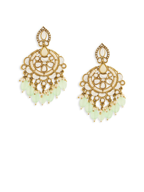 Gold toned, green and white oval shaped drop earrings, has kundan studded and beaded details