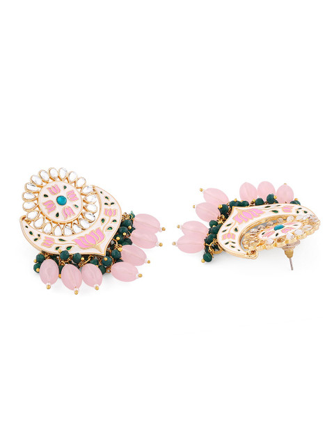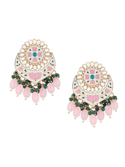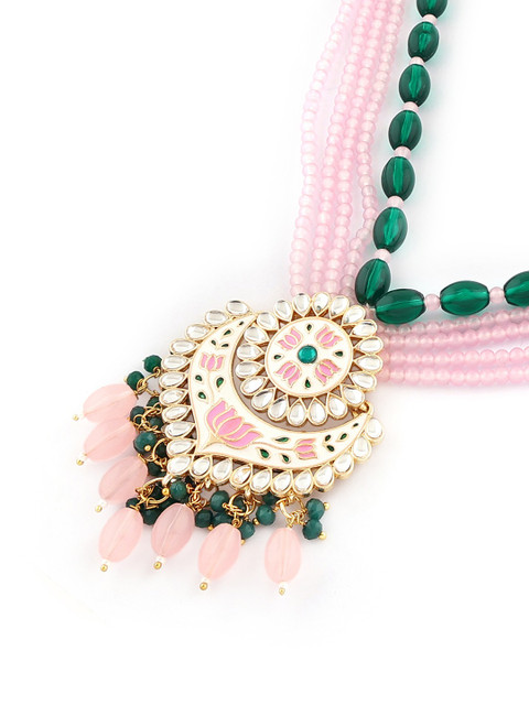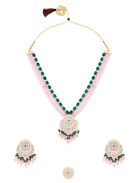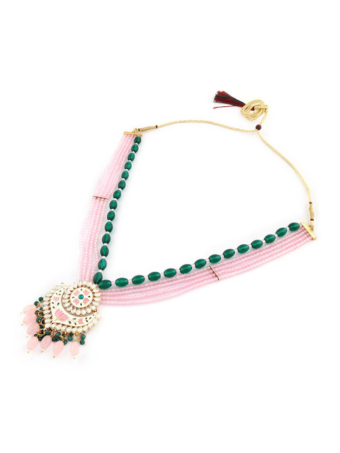 Gold-plated necklace, has white and pink kundan-studded and pearl beaded detail, secured by drawstring closure