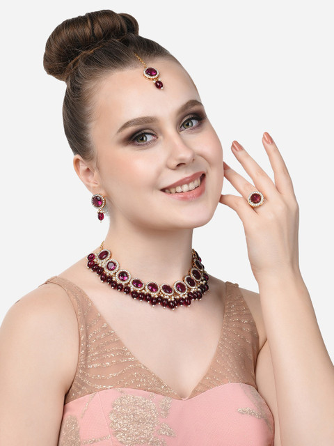This jewellery set consists of a necklace, a maangtikka, a finger ring and a pair of earrings