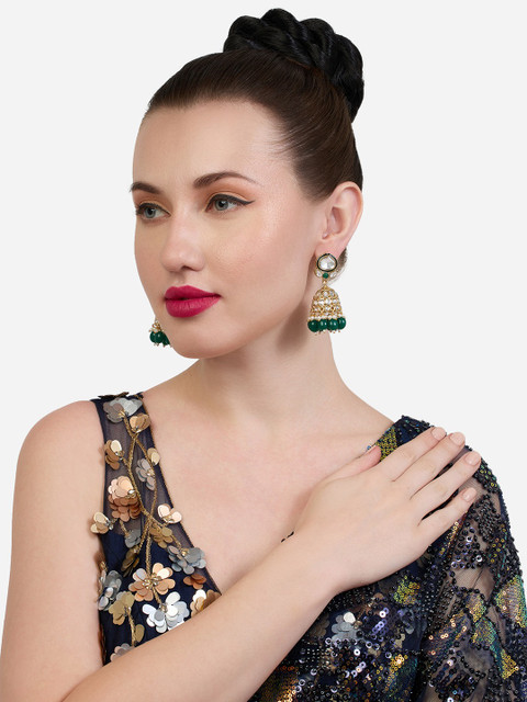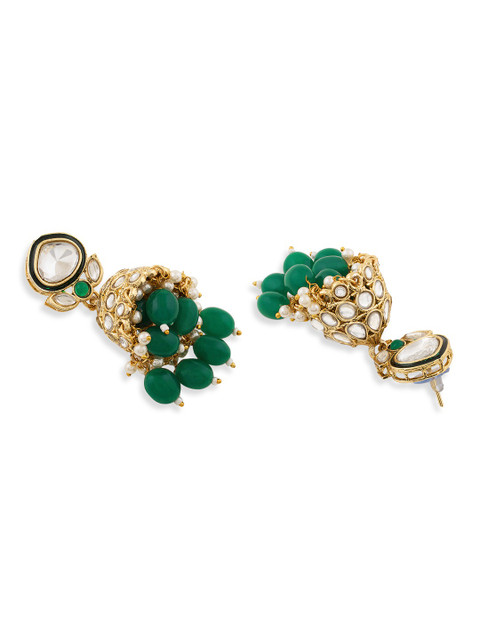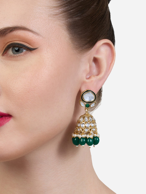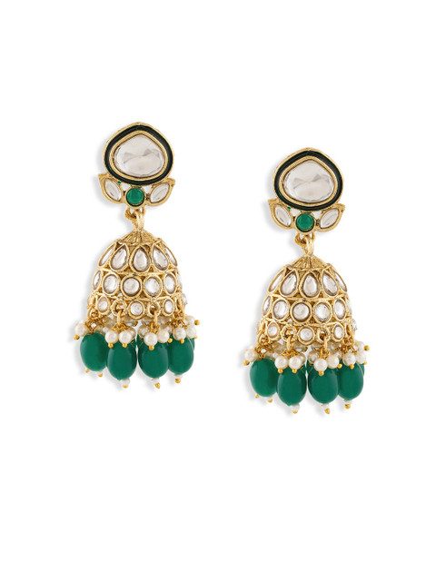 Gold-toned, green and white dome shaped jhumkas, gold-plated, has kundan studded and pearls beads details