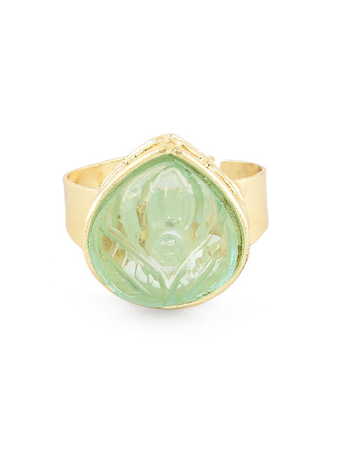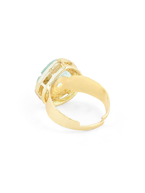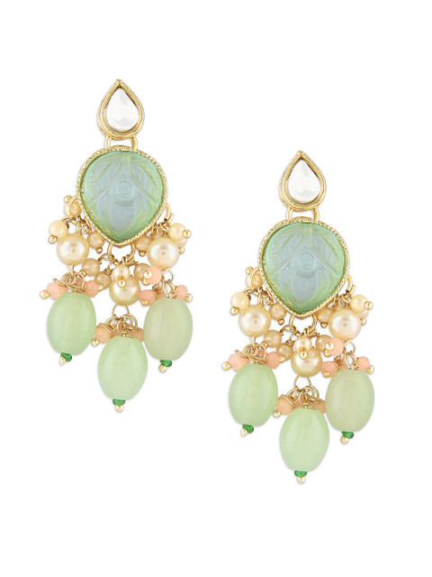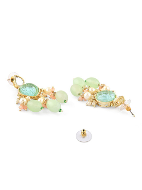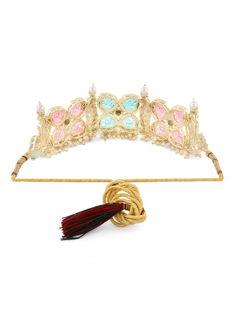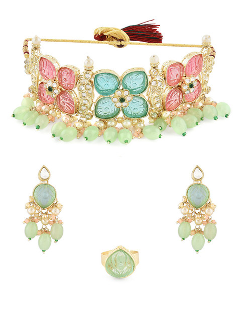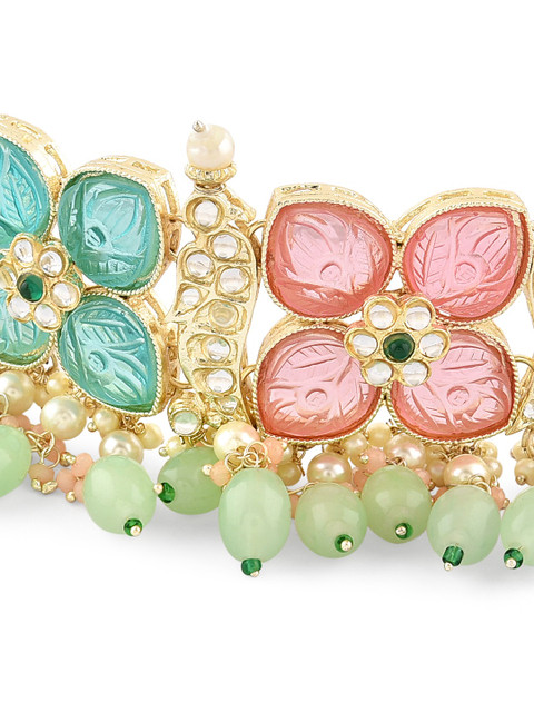 Gold-plated choker necklace has white, blue& pink stone-studded and green beaded details