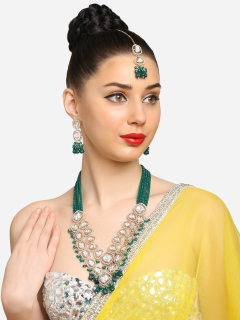 This jewellery set consists of a necklace a pair of earrings and a maangtika
