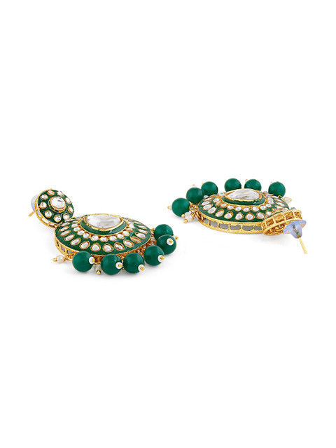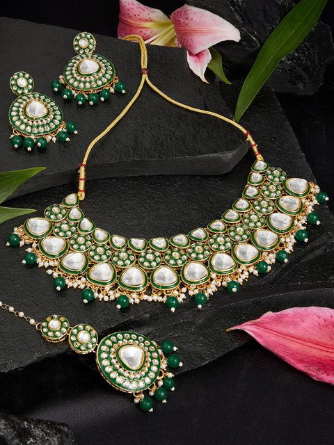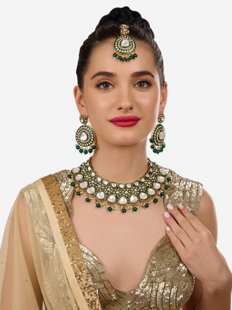 Gold-plated choker necklace has green stone-studded and beaded details