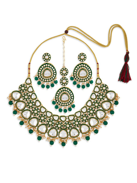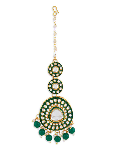 This jewellery set consists of a necklace, a pair of earrings and a maang tikka