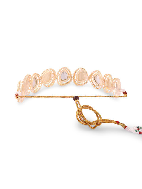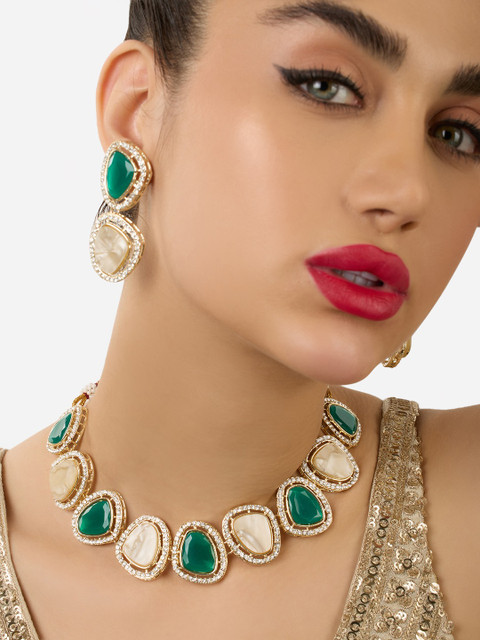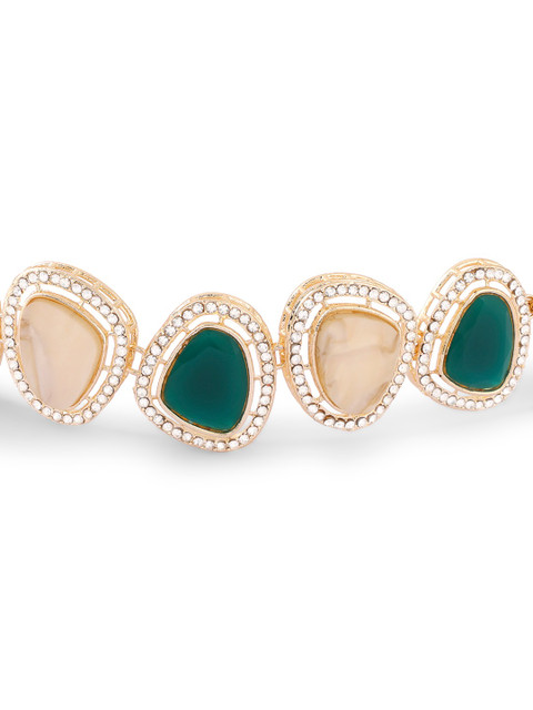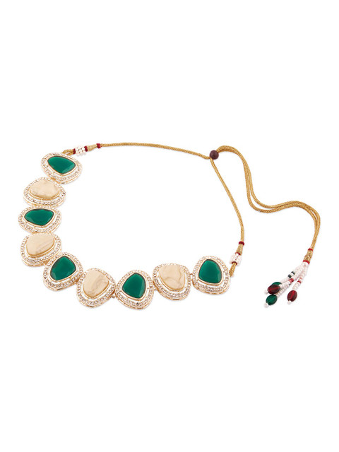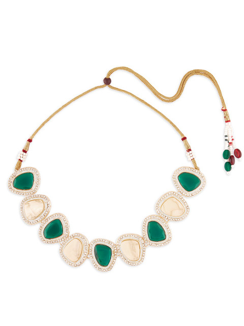 Gold-plated choker necklace, has green and peach coloured stone-studded details