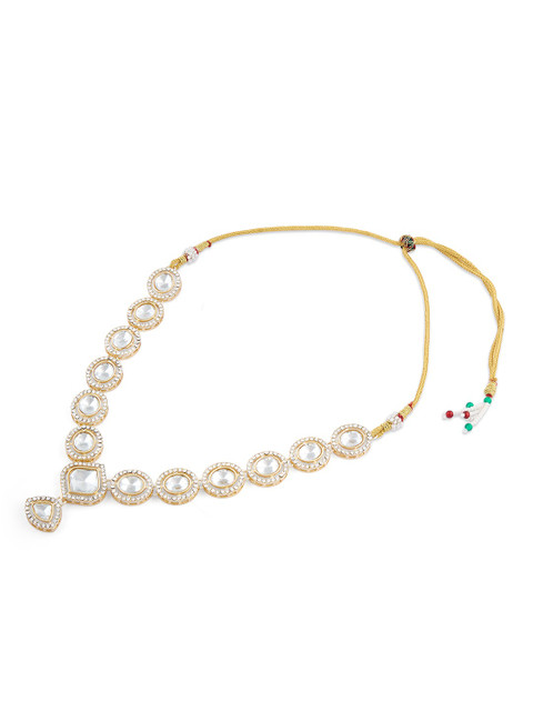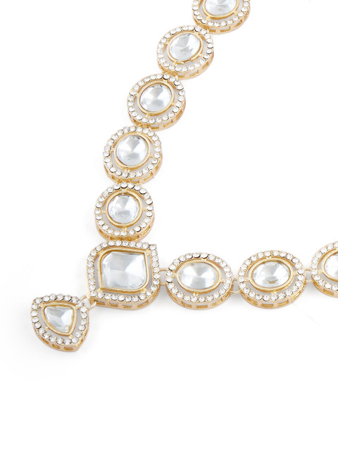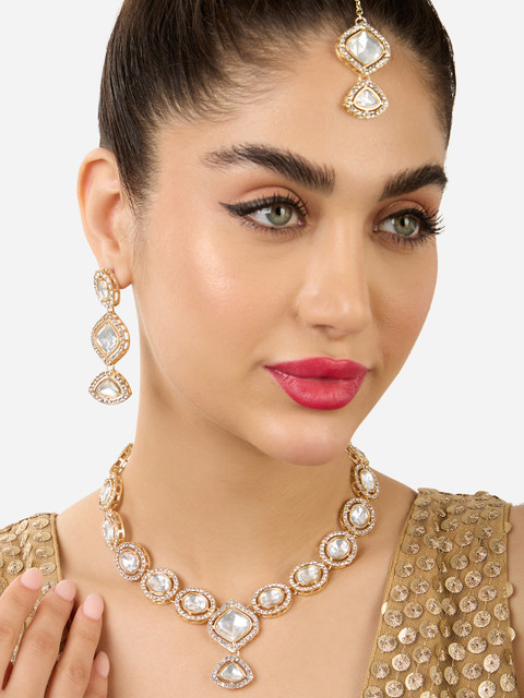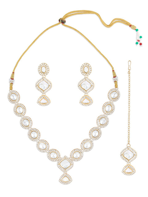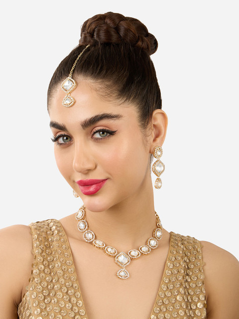 This jewellery set consists of a necklace, a pair of earrings and a maang tikka