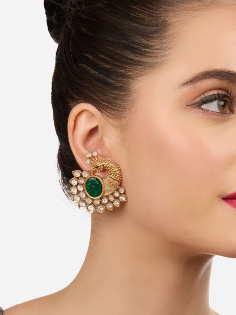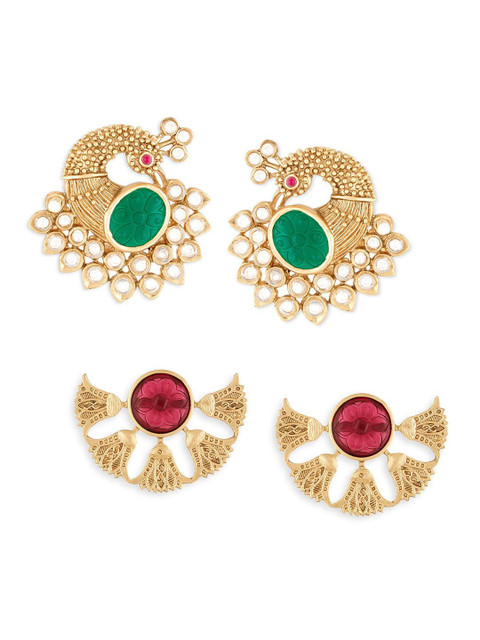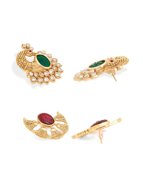 Design: Gold-toned, white & green animal shaped studs, gold-plated has artificial stones studded & beaded details