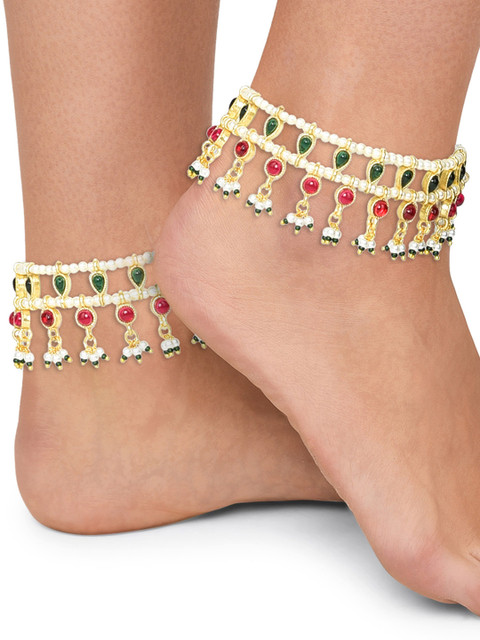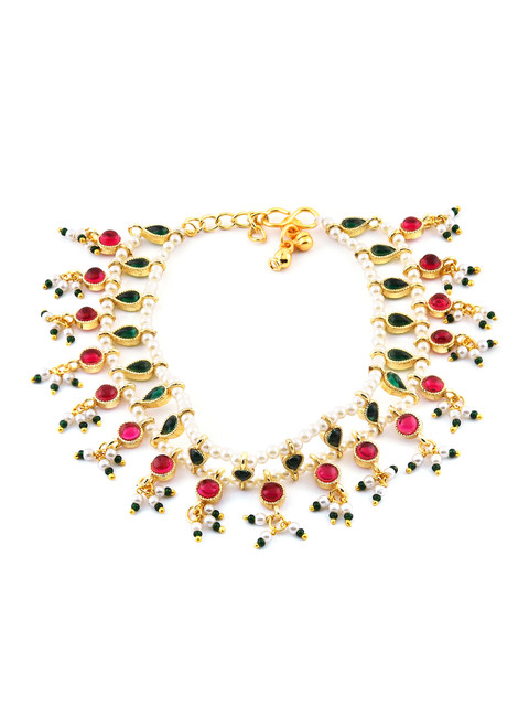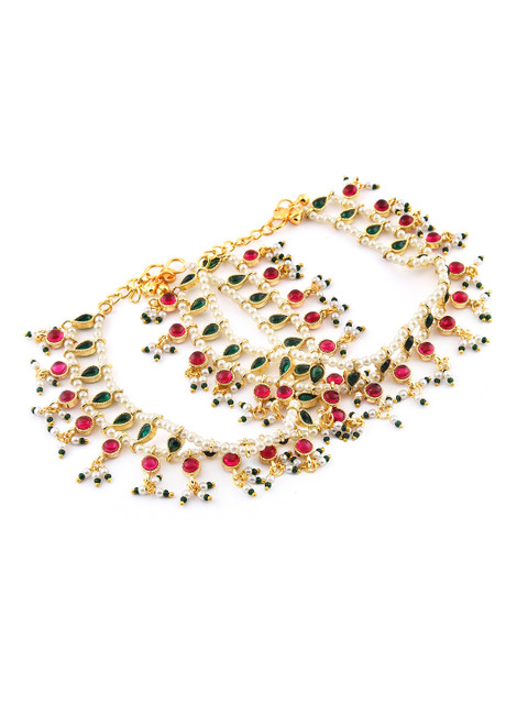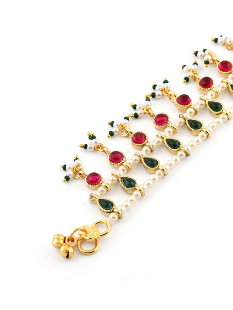 Set Of 2 gold-plated anklets, each has green and pink kundan-studded and white beaded detail, each secured with a hook closure