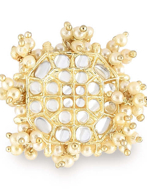 Gold-plated white stone-studded and beaded adjustable finger ring