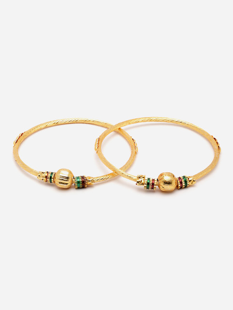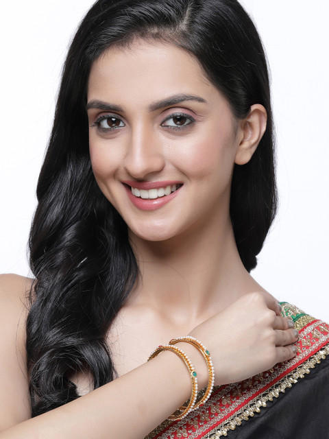 Set of 2 gold-plated bangles, each has a white pearl beaded details with red and green stone-studded details, secured with slip-on closure