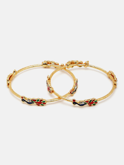 Set of 2 gold-plated bangles, each has a peacock shaped design with white stone-studded and enameled details, each secured with slip-on closure