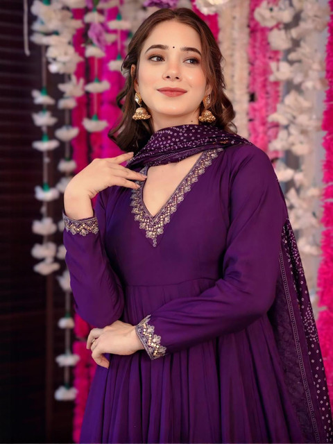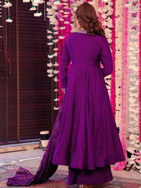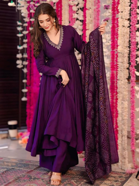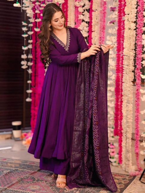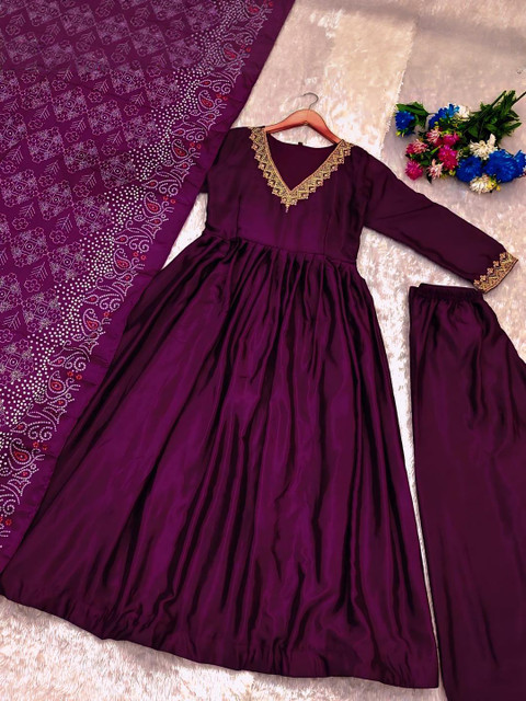 The kurta features delicate embroidery along the neckline and cuffs, enhancing its ethnic elegance. The set includes matching palazzo pants and a flowy Poly Chinon dupatta with ethnic printed patterns, adding a festive flair.