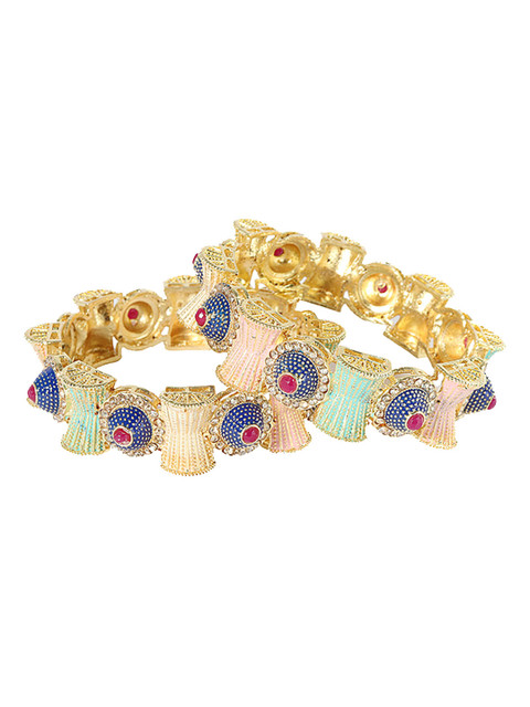 Set of 2 Gold-toned, blue and green, gold-plated bangles, each has white Zircon Diamond Stone-studded details, secured with slip-on closure