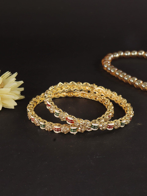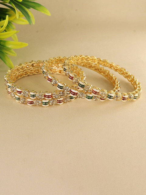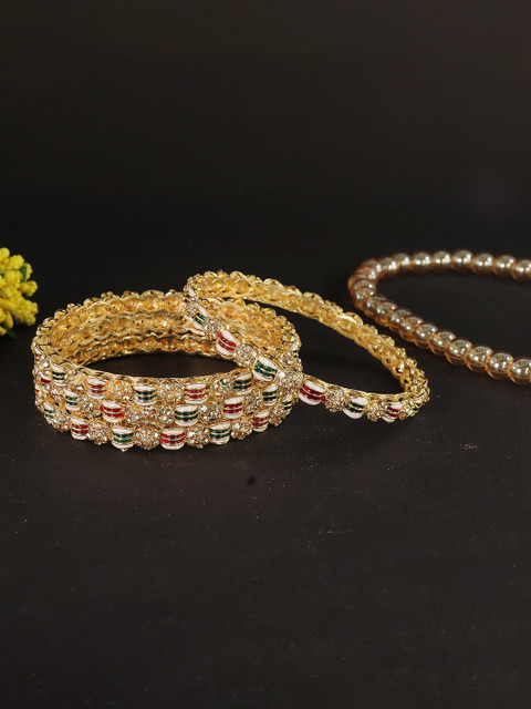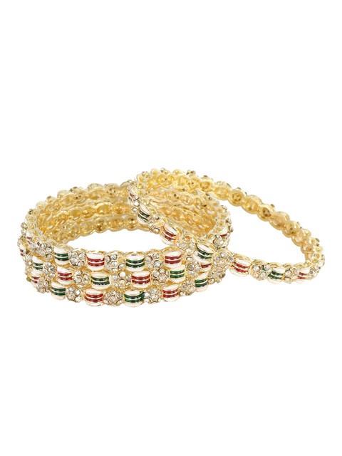 Set of 4 Gold-tined, white and green, gold-plated bangles, each has white Zircon Diamond Stone-studded details, secured with slip-on closure