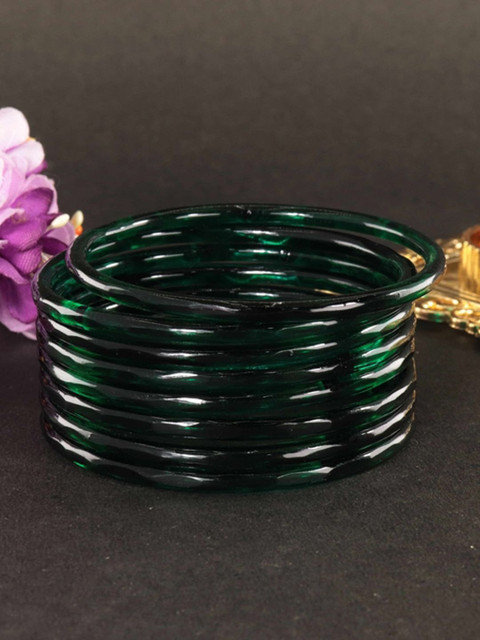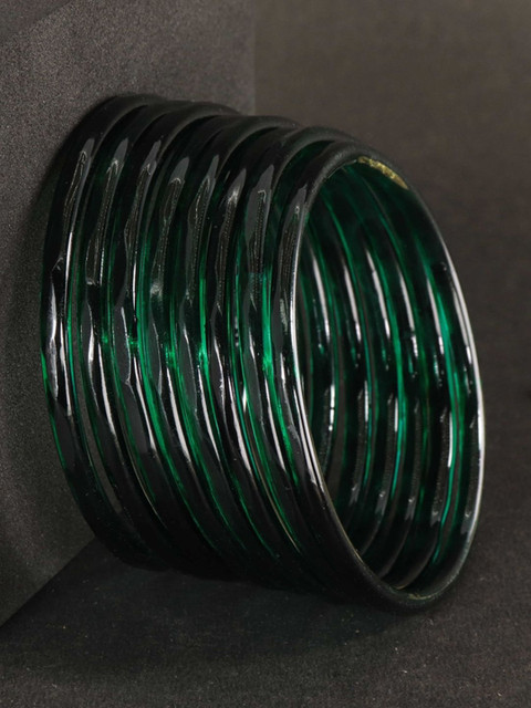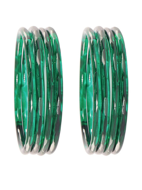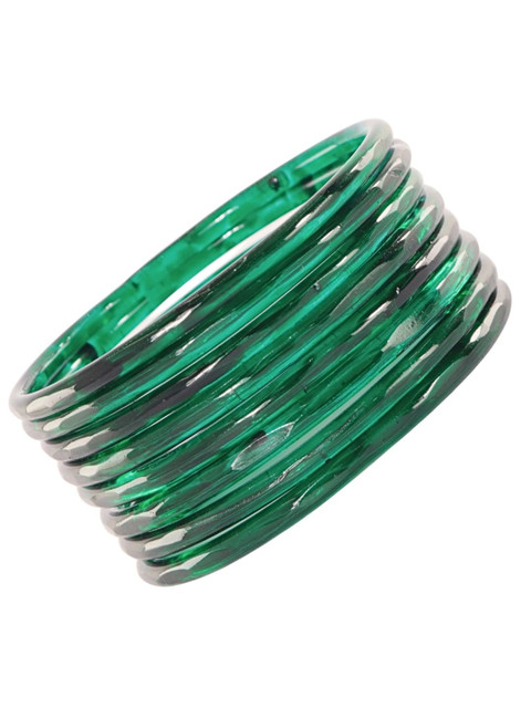 Set of 8 bangles, each has green glass diamond cut textured details, secured with slip-on closure