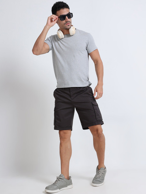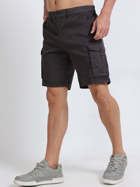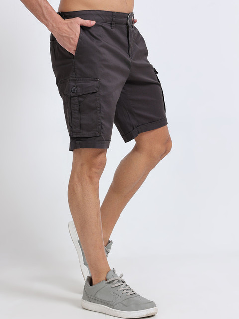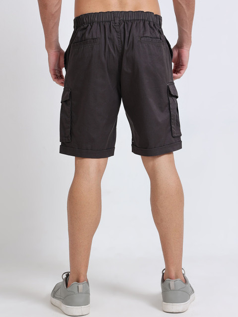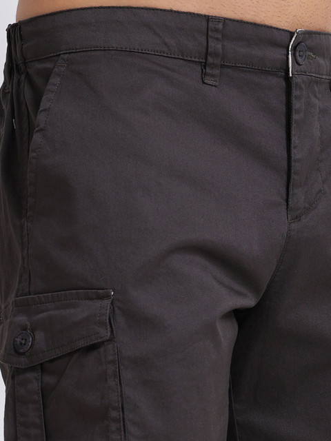 Taupe solid mid-rise outdoor cargo shorts, has 6 pockets, button closure
