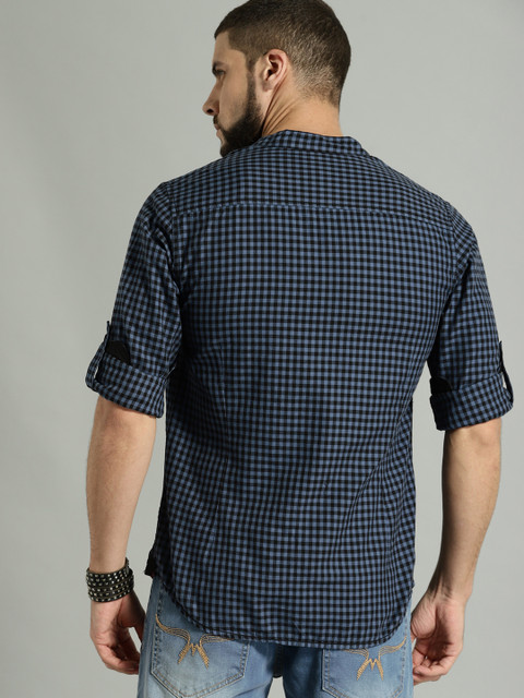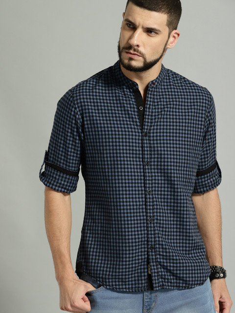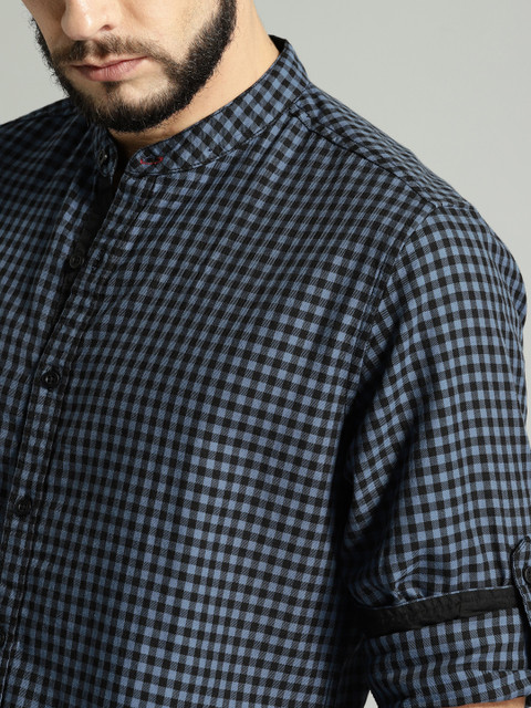 Blue and black checked casual shirt, has a mandarin collar, long sleeves, curved hem