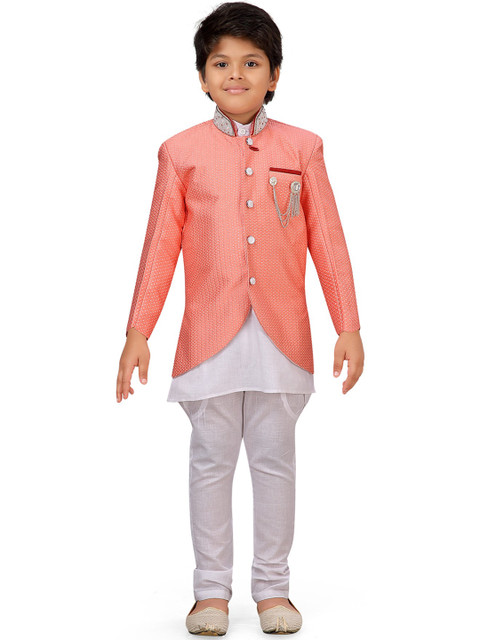 Aj DEZInES Boys Peach-Coloured Woven-Design Sherwani Set
