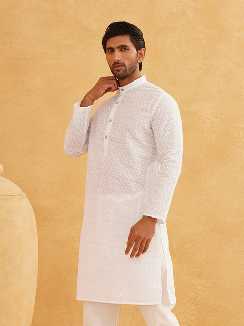 White embroidered straight kurta, has a mandarin collar, long sleeves, straight hem, and side slits